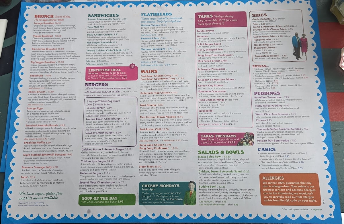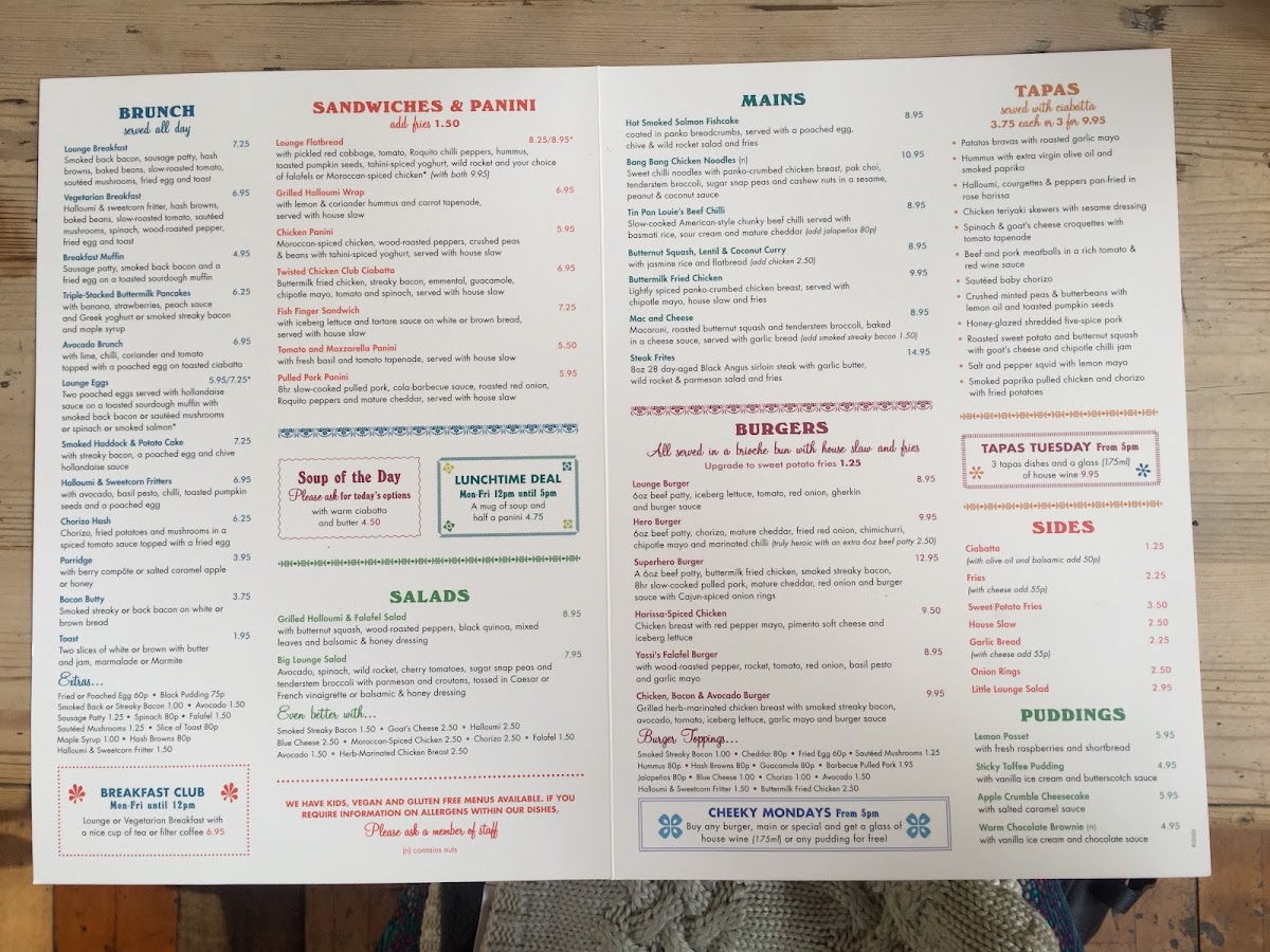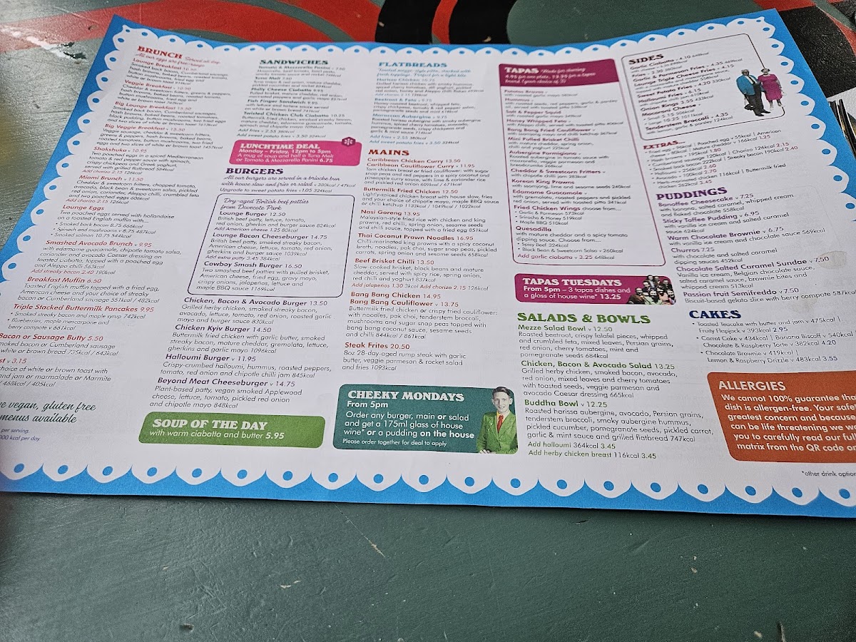 The menu showcases a variety of dishes, from hearty breakfasts to satisfying mains and lighter bites. The breakfast options are particularly noteworthy, with favorites like the 'Full English' and 'Avocado Toast' prepared to perfection. For lunch or dinner, the tapas-style dishes are a highlight, perfect for sharing with friends. The 'Lounge Burger' is a standout with its juicy patty, fresh ingredients, and homemade sauce, making it a must-try for burger lovers. The vegan and vegetarian options are also top-notch, with dishes like the 'Falafel Wrap' offering a flavorful and satisfying meal.
