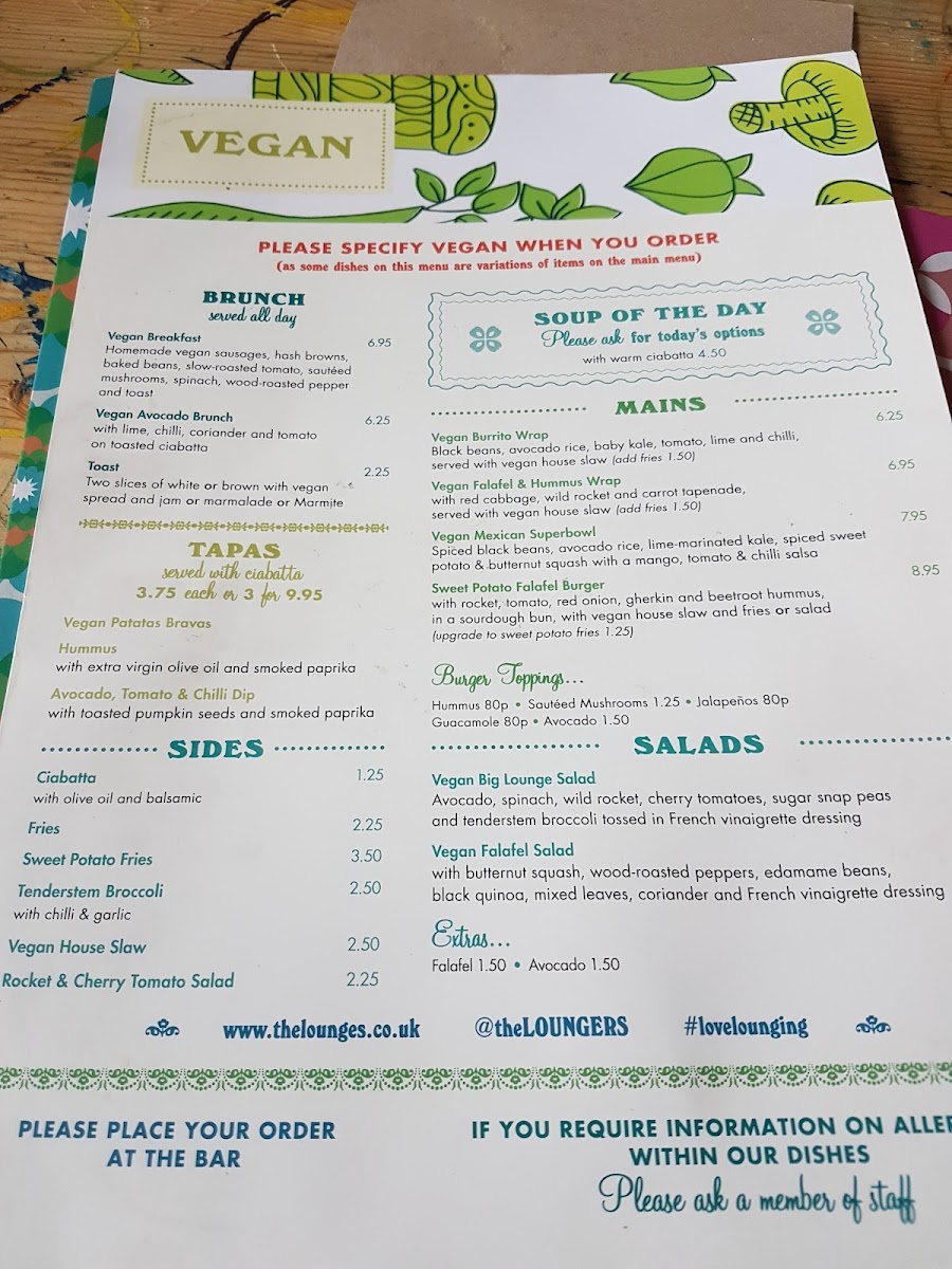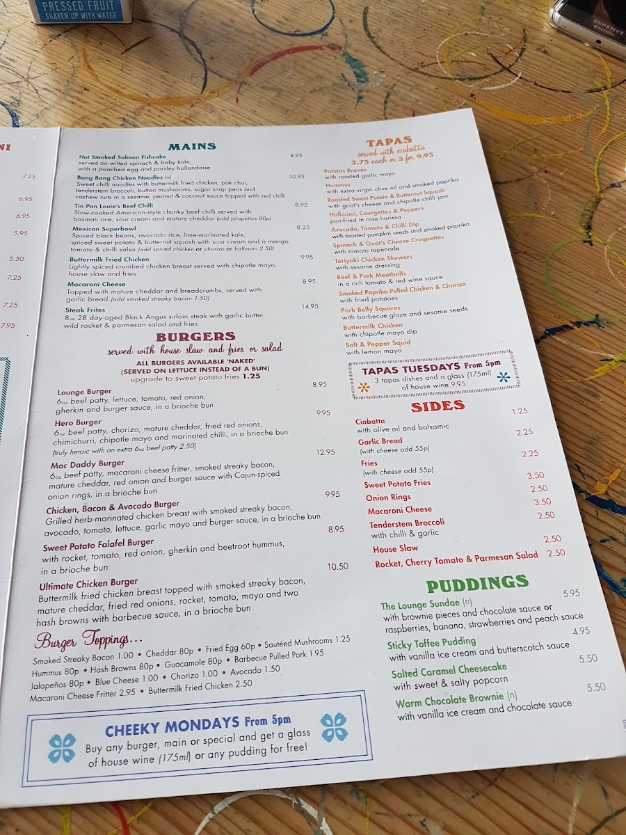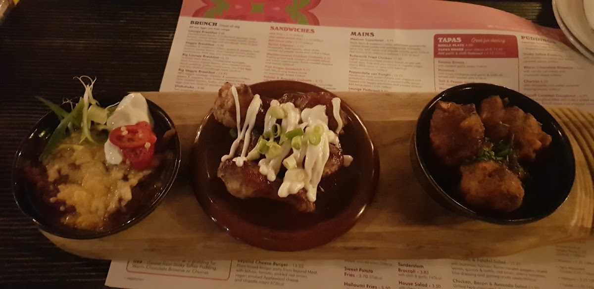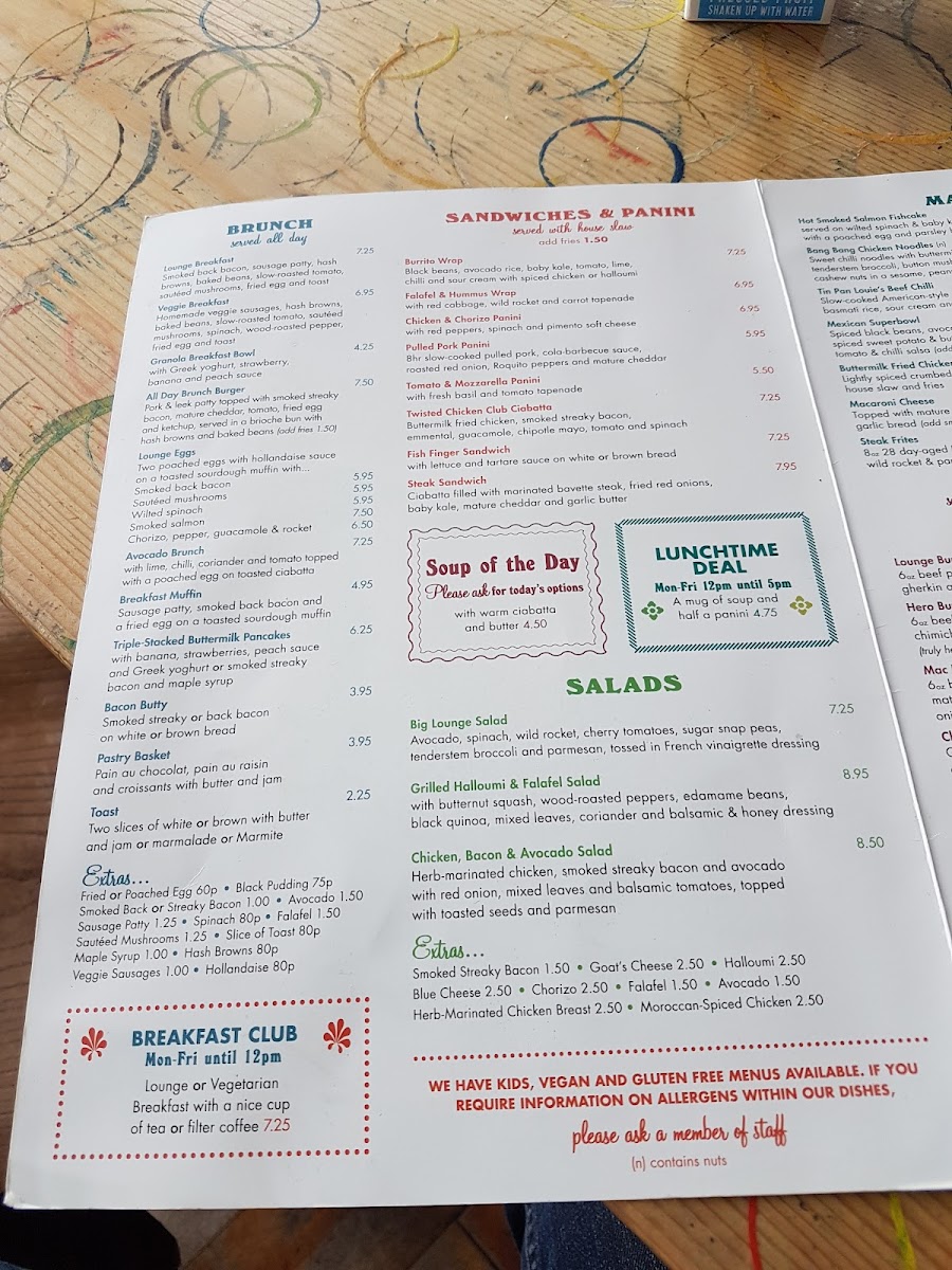 The menu showcases a variety of dishes, from hearty breakfasts to satisfying mains and lighter bites. The breakfast options are particularly noteworthy, with favorites like the 'Full English' and 'Avocado Toast' prepared to perfection. For lunch or dinner, the tapas-style dishes are a highlight, perfect for sharing with friends. The 'Lounge Burger' is a standout with its juicy patty, fresh ingredients, and homemade sauce, making it a must-try for burger lovers. The vegan and vegetarian options are also top-notch, with dishes like the 'Falafel Wrap' offering a flavorful and satisfying meal.